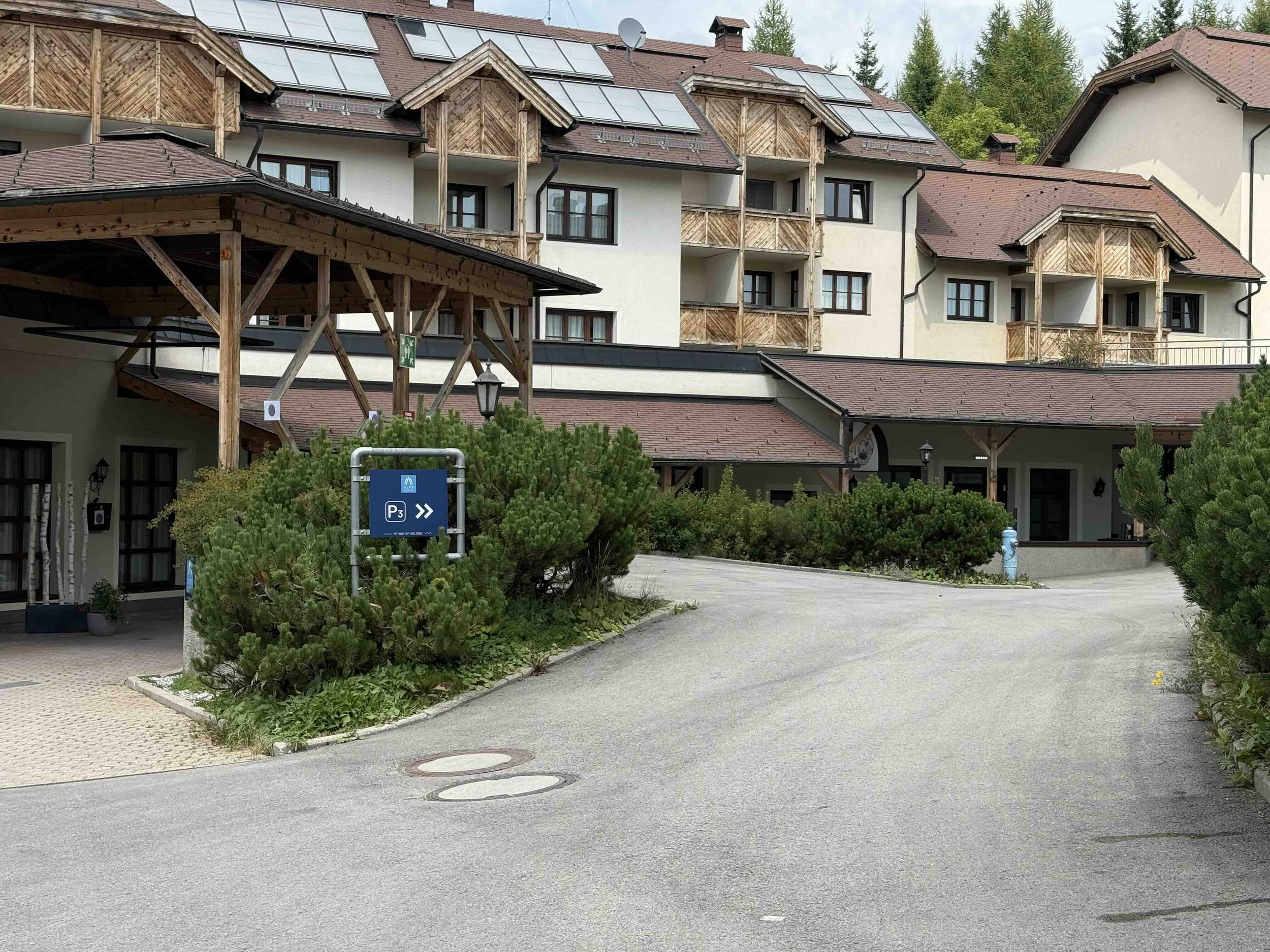 After about 1 km, you will see a hotel on the left. Immediately after the hotel, turn left uphill towards the hotel reception into parking garage P3.